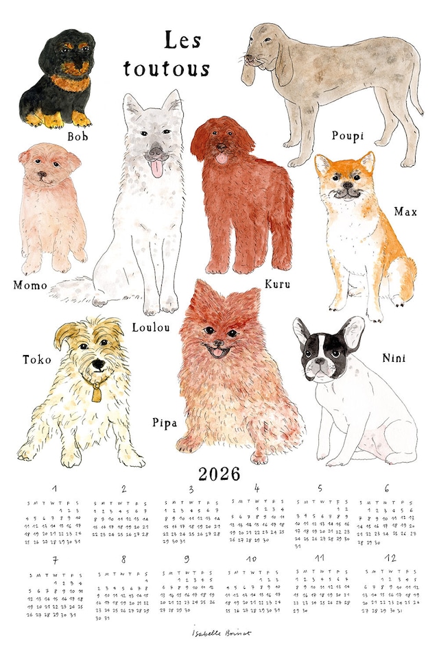毎年ご好評いただいているファブリックカレンダー。 キッチンクロスサイズのリネンに、イラストとカレンダーをデジタルプリントしました。 カレンダーとして壁に飾るのはもちろんのこと、シーズン後にはキッチンクロスとしてもお使い頂けます。 こちらはフランスのアーティスト、イザベル・ボワノさんのデザイン。 個性的で愛らしい様々な犬たちとそれぞれの名前が描かれています。犬たちの表情やのんびりとした雰囲気が魅力の1枚です。年末年始のご挨拶や、大切な方へのギフトとしてもおすすめです。 ■イザベル ボワノ ISABELLE BOINOT フランス・アングレーム在住のアーティスト。 アングレームの美術大学を卒業後、イラスト、出版を中心に活動を開始。 デッサンやコラージュ、刺繍、映像など多岐にわたる表現で作品を発表。 『シンプルで心地いいパリの暮らし』、『わたしのおやつレシピ』『おとしより パリジェンヌが旅した懐かしい日本』、『パリジェンヌの田舎暮らし』など著書多数。 またNHK Eテレ「パリジェンヌの田舎暮らし」に出演するなどマルチに活躍中。 ・サイズ:W 45 × L 65 cm ・素材:linen 100% (普通地) ・生産国: Lithuania(リトアニア) ー注意事項ー ※商品画像は、光の当たり具合やブラウザにより、実際の色味と異なって見える場合がございます。