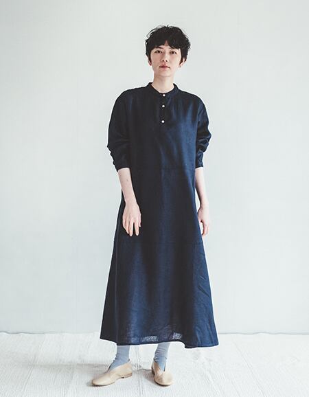 フォグリネンワークの2021springより、バンドカラーの襟元で、清潔感のあるきりっとした雰囲気のロングシャツワンピースです。 ウエストと、太ももあたりに2か所切り替えがあり、1 枚仕立てに比べて動いたときにふわりと表情がでます。フルレングスでたっぷりと生地をつかったワンピースは、1枚でさまになるので、シンプルに素足でフラットシューズを合わせたり、ショートソックスを合わせていただいても素敵です。ゆったりしたリラックス感のある着心地なので、お家でのくつろいだ時間にも。