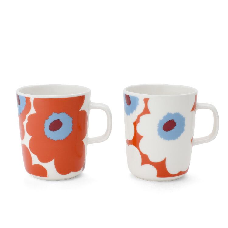 クラシックなUnikko(ウニッコ)柄をスカイブルー×トマトレッドの鮮やかなカラーリングで仕上げた、デザインが異なるマグカップセット。